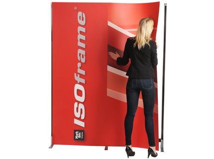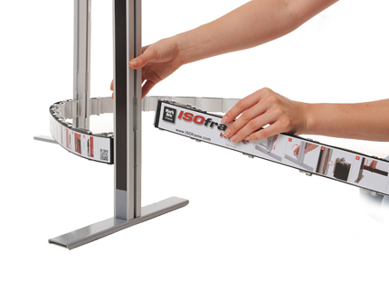 ISOframe wave eröffnet 1000 neue Möglichkeiten für Ihren Messestand. Das Ausstellungssystem mit der patentierten Flexi-Link Verbindung lässt sich in fasst jede gewünschte Form bringen -je nach Bedarf und den gegebenen Stellmöglichkeiten. Je nach Einsatz und Anforderung werden beliebig viele Flexi-Link-Verbinder aneinandergefügt, das Gestänge hineingesteckt und das gesamte Display in die gewünschte Form gebogen. Die patentierte Flexi-Wellen-Verbindung sorgt auch beim Biegen und Dehnen des Displays bis zu 180° maximale Standstabilität. Mit passenden Extension-Modulen lässt sich ISOframe beliebig um jeweils 800 cm breite Einheiten verlängern. Dank der Schnell-Klemm-Verbindungselemente ist die Montage werkzeuglos durchführbar. Zusätzliche Träger ermöglichen das Anbringen von Regalen, Tischelementen, TFT- oder LCD-Bildschirmen. ISOframe wave ist in zwei Höhen erhältlich: 2250 mm (Midi) und 2450 mm (Maxi).