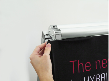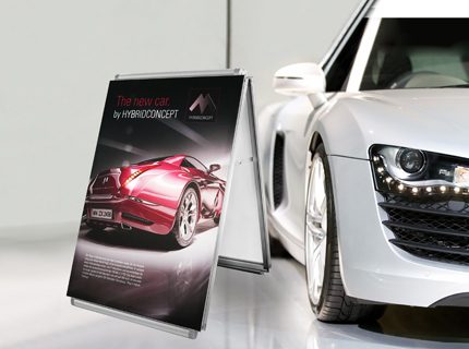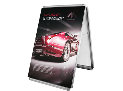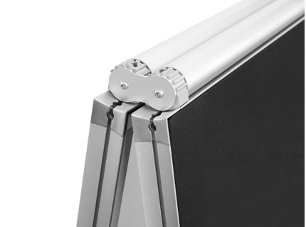 Ein toller Kundenstopper für textile Banner: Das Maxiboard lässt sich aufklappen, die textilen Banner mit Flachkedersystem können jederzeit schnell gewächselt werden. Alle Teile sind aus hochwertigem silber-eloxiertem Aluminium bzw. Spritzguss aus Metall und Kunststoff.