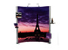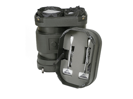 Das komplette Scherengittersystem passt handlich verpackt in einen ovalen Koffer, der sich (versehen mit einer Grafikbanderole) auch als Theke einsetzen lässt.