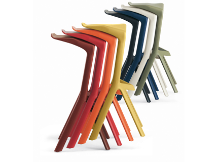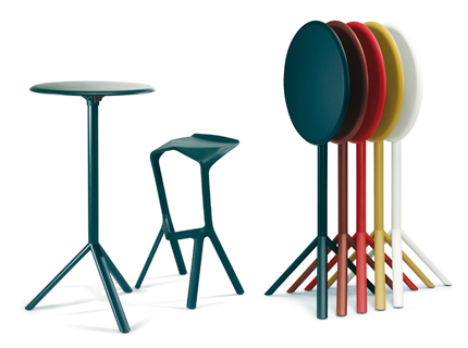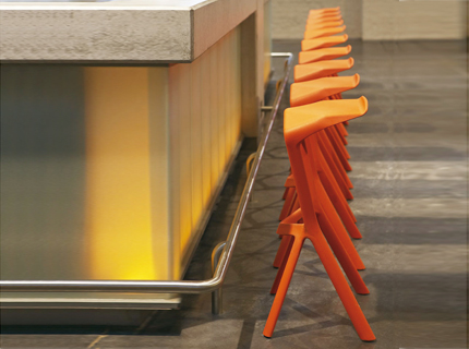 Gewinnendes Design von Konstantin Grcic: Stapelbarer Barhocker aus verstärktem Polypropylen. Passend dazu: Dreibeiniges Tischgestell aus verzinktem, pulverbeschichtetem Stahl. Stapelbar und volumensparend bei Transport und Lagerung. Beide Produkte für Innen- wie Aussenbereich.