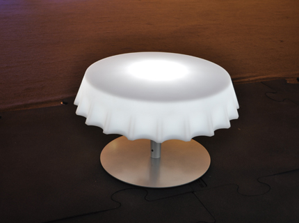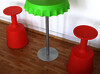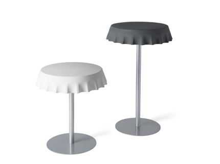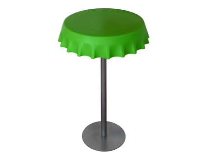 Ein moderner Stehtisch in Flaschendeckel-Optik, der Indoor sowie Outdoor verwendet werden kann.