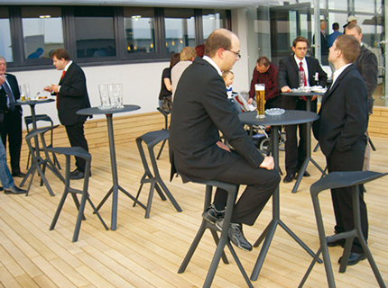 Gewinnendes Design von Konstantin Grcic: Dreibeiniges Tischgestell aus verzinktem, pulverbeschichtetem Stahl. Passend dazu: Barhocker aus verstärktem Polypropylen. Stapelbar und volumensparend bei Transport und Lagerung. Beide Produkte für Innen- wie Aussenbereich.