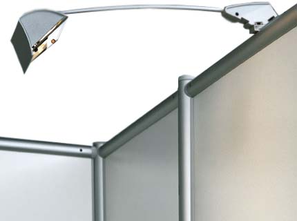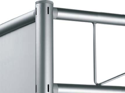 Auch in einer Größe von nur 3 m² kann das OCTAquick-System überzeugen und es gibt immer noch nichts, worauf dieser Messestand verzichten müsste. Die Kombination einzelner Elemente und Zubehörteile ist es, die jede OCTAquick-Variante komplett und professionell wirken lässt. Die Stoffpaneele im Hintergrund sind mit Firmenlogo und Schriftzug bedruckbar und lassen sich immer wieder einsetzen.