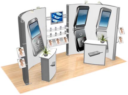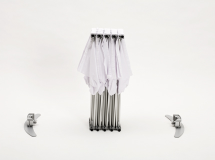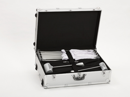 Das komplette Scherengittersystem passt handlich verpackt in einen ovalen Koffer, der sich (versehen mit einer Grafikbanderole) auch als Theke einsetzen lässt.