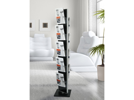Rundum flexibel: Geräuschlos, frei drehbar in beide Richtungen ist Dacapo Twist. In das doppelseitige schwarzmatte Display mit den silbermatten Seiten werden die transparenten Container einfach ein-, aus- und umgehängt. Container der Formate A4, A5 und A6 stehen zu Ihrer Auswahl bereit.