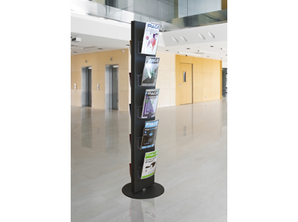 Zweiseitiges schwarz pulverbeschichtetes Metall , frei drehbar montiert auf Basis mit Fräsungen passend für Prospekttaschen Polycarbonat zum Einhängen