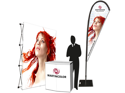 Dieses Messepaket kann sowohl im In- als auch im Outdoor-Bereich eingesetzt werden. Alle aufgeführten Systeme sind wetterfest, lediglich die Faltwand muss bei Außeneinsatz zusätzlich mit Gewichten versehen werden. Bei dem Wandsystem EasyFabric ist es besonders praktisch, dass sich der Grafikdruck direkt auf dem Faltwandsystem befindet, sodass innerhalb weniger Minuten die komplette Faltwand einsatzbereit ist. Der Druck der individualisierten Grafik erfolgt über hochauflösendes Textil-Sublimationsverfahren. Der textile Druck ist bei 30 Grad waschbar. Bei Einsatz im Outdoor-Bereich müssen im Scherengitten des Systems rückseitig zusätzliche Beschwerungselemente (z.B. Wasserschlauch) eingebracht werden.