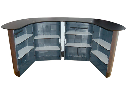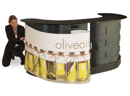 Zwei Transportboxen, die zu einer extra großen Theke verwandelt werden können. Dazu brauchen Sie nur die Boxen zu öffnen und durch Montage der Thekenplatte miteinander verbinden. Anschließend werden die Sockelblende, der Thekendruck und die Einlegeböden angebracht. Die Theke bietet einen geräumigen Stauraum bei Messen und sonstigen Veranstaltungen. Auf der Rückseite der Theke befinden sich herausnehmbare Regale für Ihre Broschüren und anderes Werbematerial, für Drinks usw. Expand PodiumCase XL kann sowohl als Theke (bei offener Box) wie auch als Podest (bei geschlossener Box) verwendet werden.