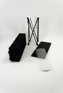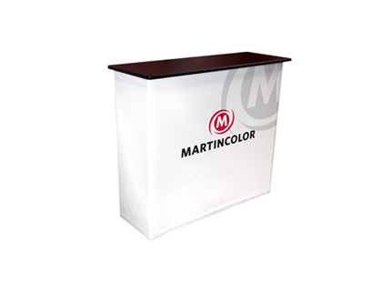 Die Fabric-Theke ist die perfekte Ergänzung zu den Easy-, Fabric- & BigFabric-Faltwänden. Ein rundherum angebrachter Digitaldruck sorgt für zusätzliche Werbefläche. Die Grafiken werden einfach mit Klettband an der Konstruktion befestigt. Dadurch ist das System mit geringen Mitteln immer wieder an neue Anlässe anpassbar. Die Fabric-Theken werden mit der gleichen Technik wie die Fabric- bzw. Textil-Messewände aufgebaut. Mit wenigen Handgriffen lassen sie sich kompakt zusammenfalten und sind damit leicht transportierbar. Die Thekenabdeckung ist in den Oberflächen Schwarz, Weiß, Silber und Holz erhältlich.