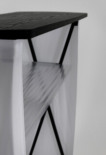 Aus Scherengitterbasis, Thekenplatte Schwarz, Weiß, Silber und Holz
