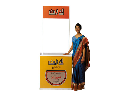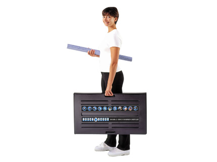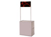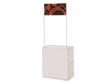 Immer dran bleiben: Ein Fußausschnitt im Rahmen der Popular-Theke erleichtert das nahe Herantreten. Natürlich ist auch dieses Modell an der Front und den Seiten individuell bedruckbar. Der Auf- und Abbau ohne Werkzeug spart bei allen Promotortheken Zeit und Aufwand.
