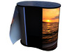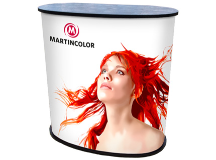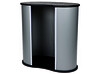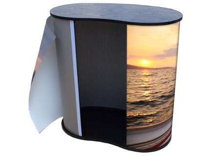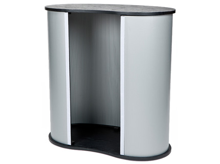 Professioneller Auftritt mit der ovalen Theke Rollo: Der Rollo bietet aufgrund seiner gekrümmten Form eine hohe Standfestigkeit und extrem viel Stabilität. Durch seine drei Aufbauteile ist er sehr leicht zu konstruieren. Die Theke ist umringt von einer robusten Lamellenbahn und einem frei gestaltbarem Druck. Die Thekenplatte ist in den Farben Schwarz, Weiß, Silber und Holz erhältlich. Das System wird inklusive zwei hochwertiger Transporttaschen ausgeliefert.