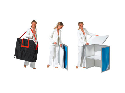 Das Besondere der Counter ALU-PRO steckt im Detail. Hochwertige Aluminiumprofile mit abgerundeten Kanten, gerahmte Ablagen und durchgehende Scharniere lassen keine Kompromisse zu. Counter ALU-PRO Theken sind problemlos von einer Person aufzubauen, natürlich ohne Werkzeug. Ideal für Veranstaltungen, Messen und Verkaufsbereiche.
