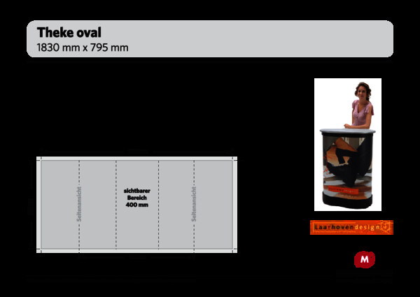 Der Transportkoffer Oval ist Theke und Rollkoffer in Einem. Der Rollkoffer ist groß genug um eine Scherengitter-Faltwand zu transportieren. Während Ihrer Messe oder Ausstellung kann der Transportkoffer dann sekundenschnell als Theke umgebaut werden. Eine individuelle Grafikbanderole wird um den Kofferkorpus gelegt und mittels Klettband befestigt. Die mitgelieferte Thekenplatte ist klappbar und aus diesem Grund leicht im Korpus verstaubar. Sie ist in den Oberflachen silber, schwarz, weiß und holzfarben erhältlich.